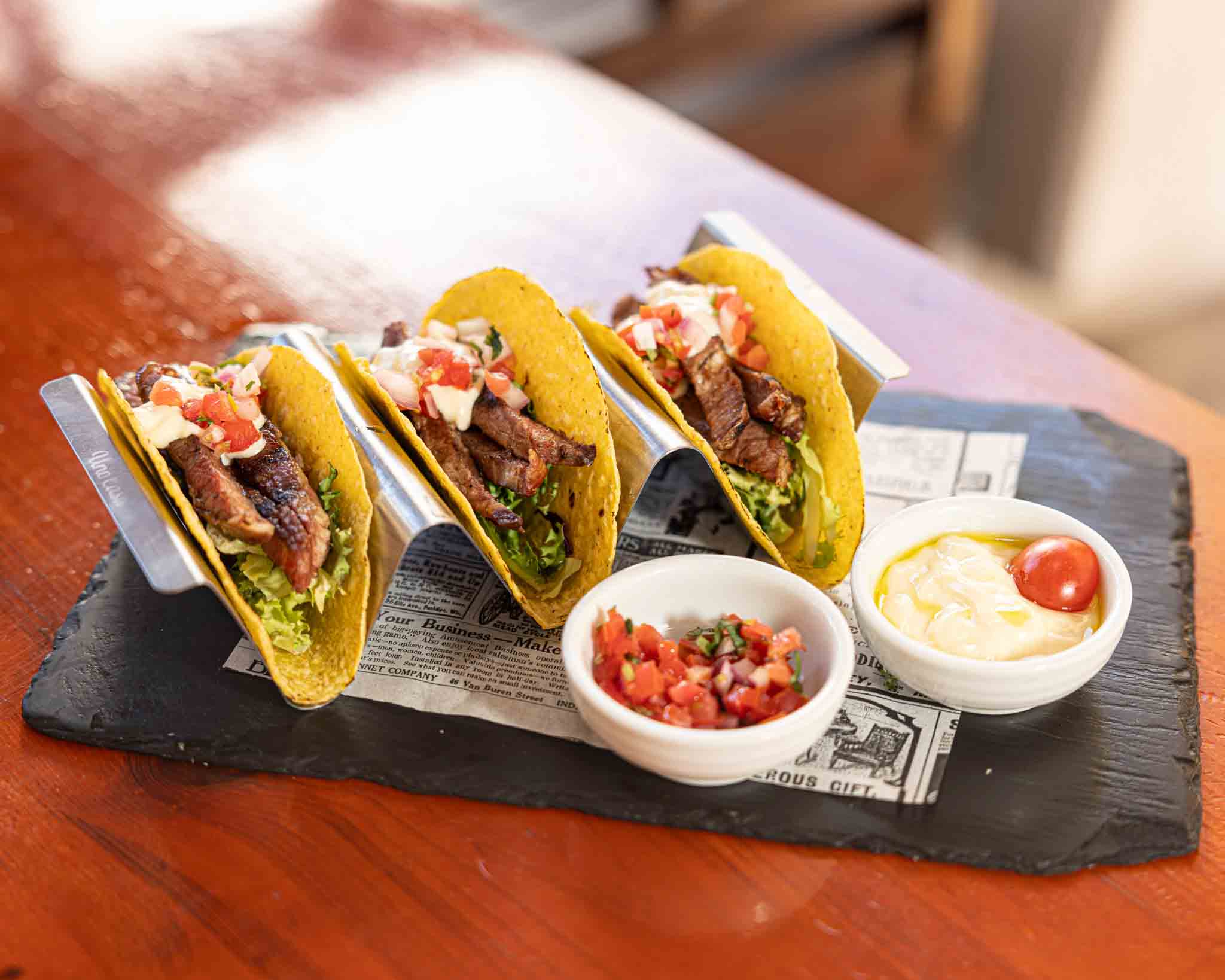 Tacos de secreto marinado y braseado con pico de gallo y nata agria