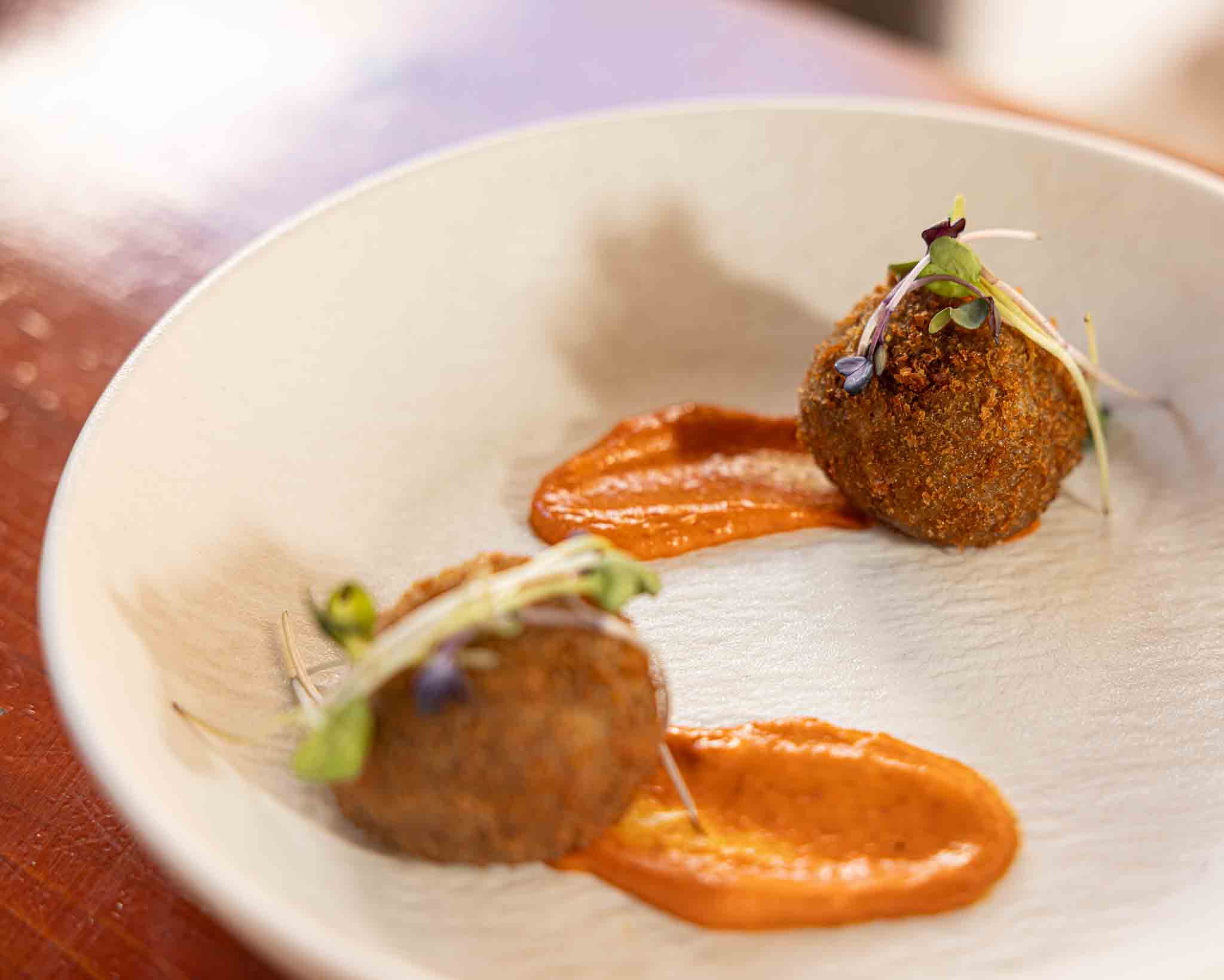 Croqueta cremosa de setas y jamón ibérico de bellota con alioli de Sriracha