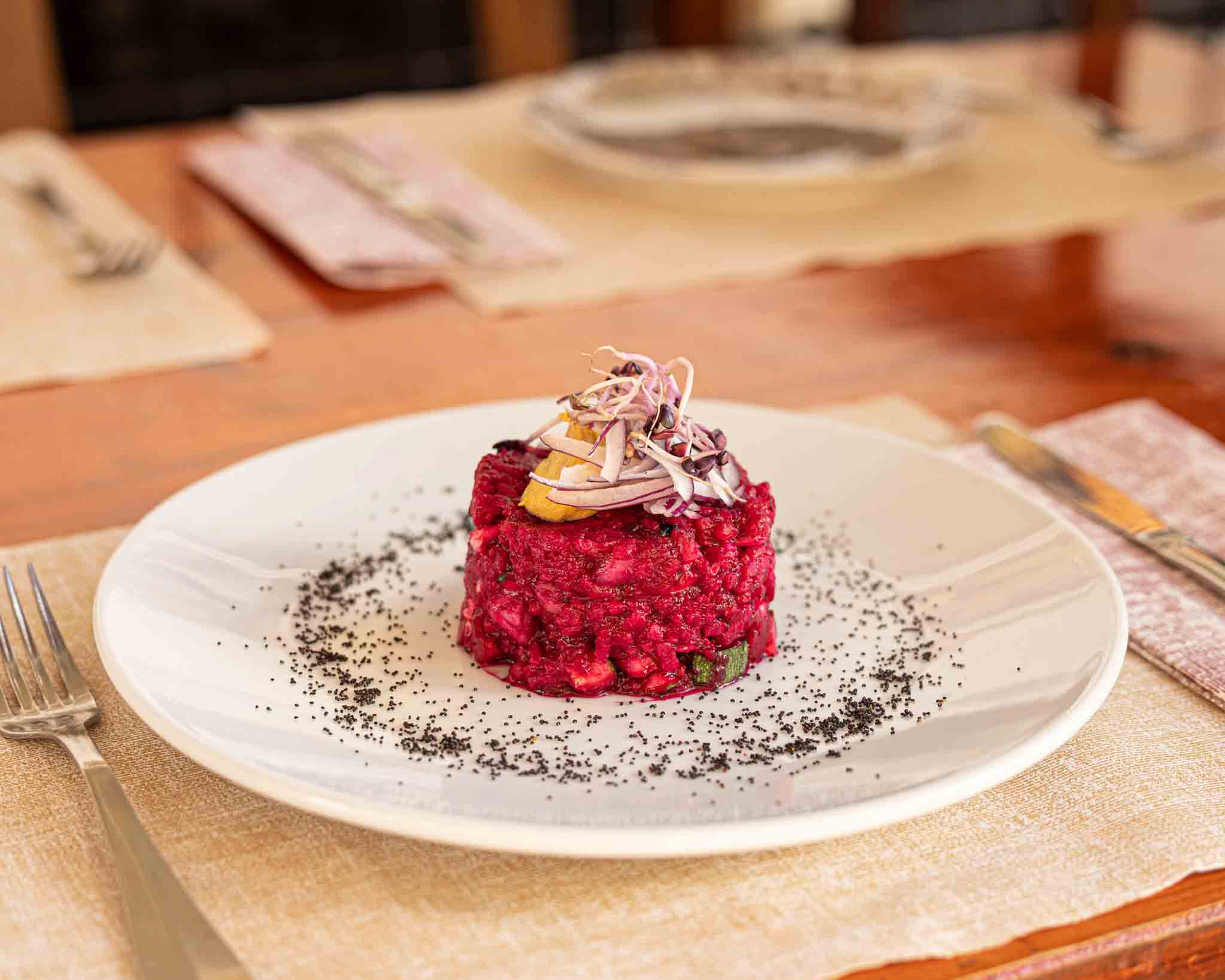 Timbal de verduras salteadas y remolacha con heura y mostaza de Dijon