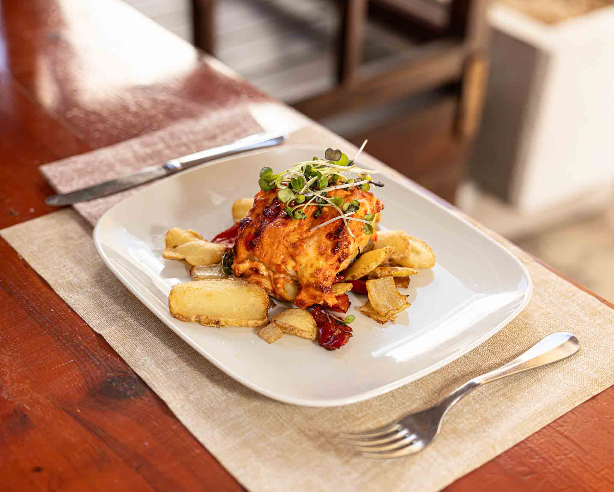 Bacalao gratinado al horno con patatas panadera y alioli de ñoras
