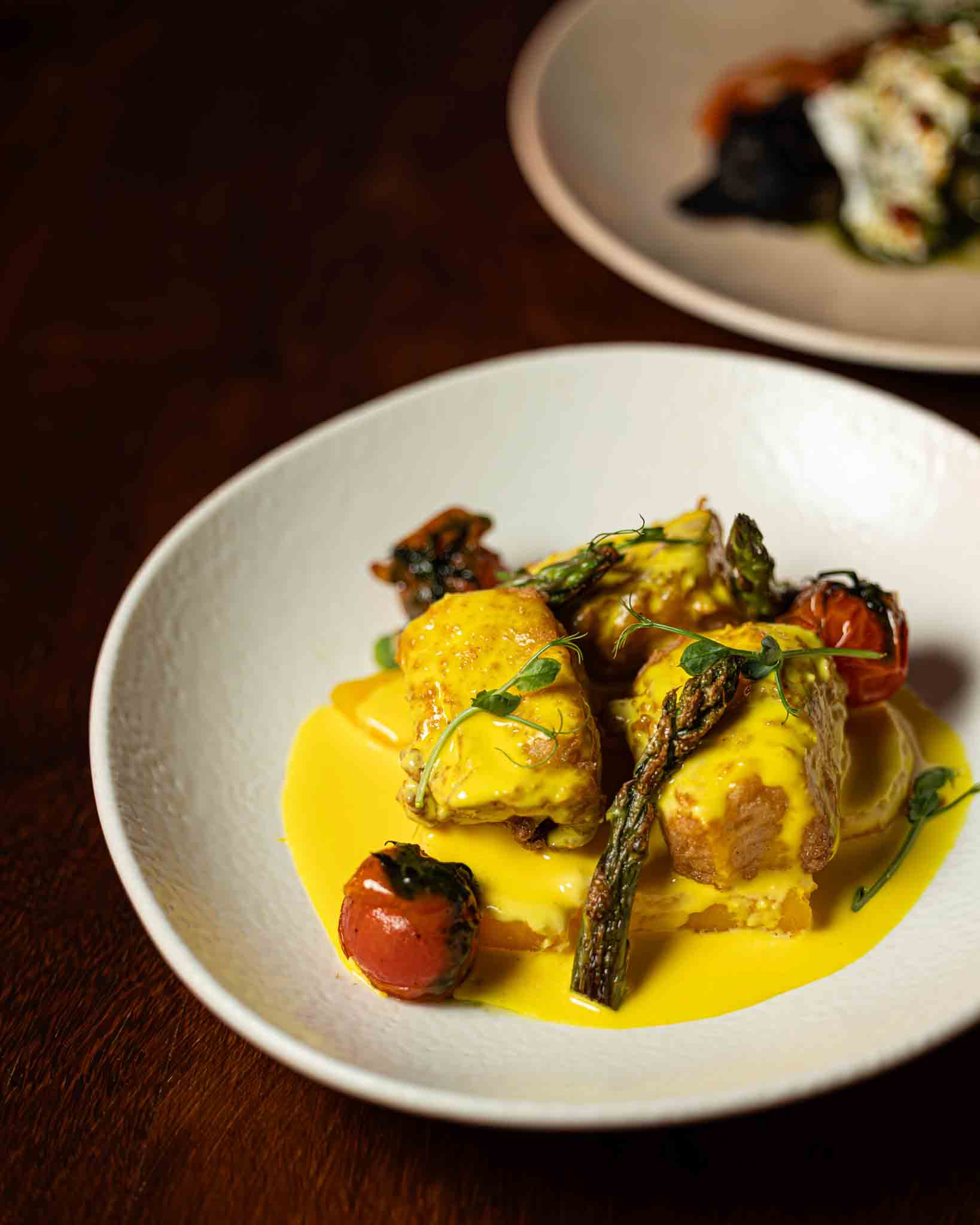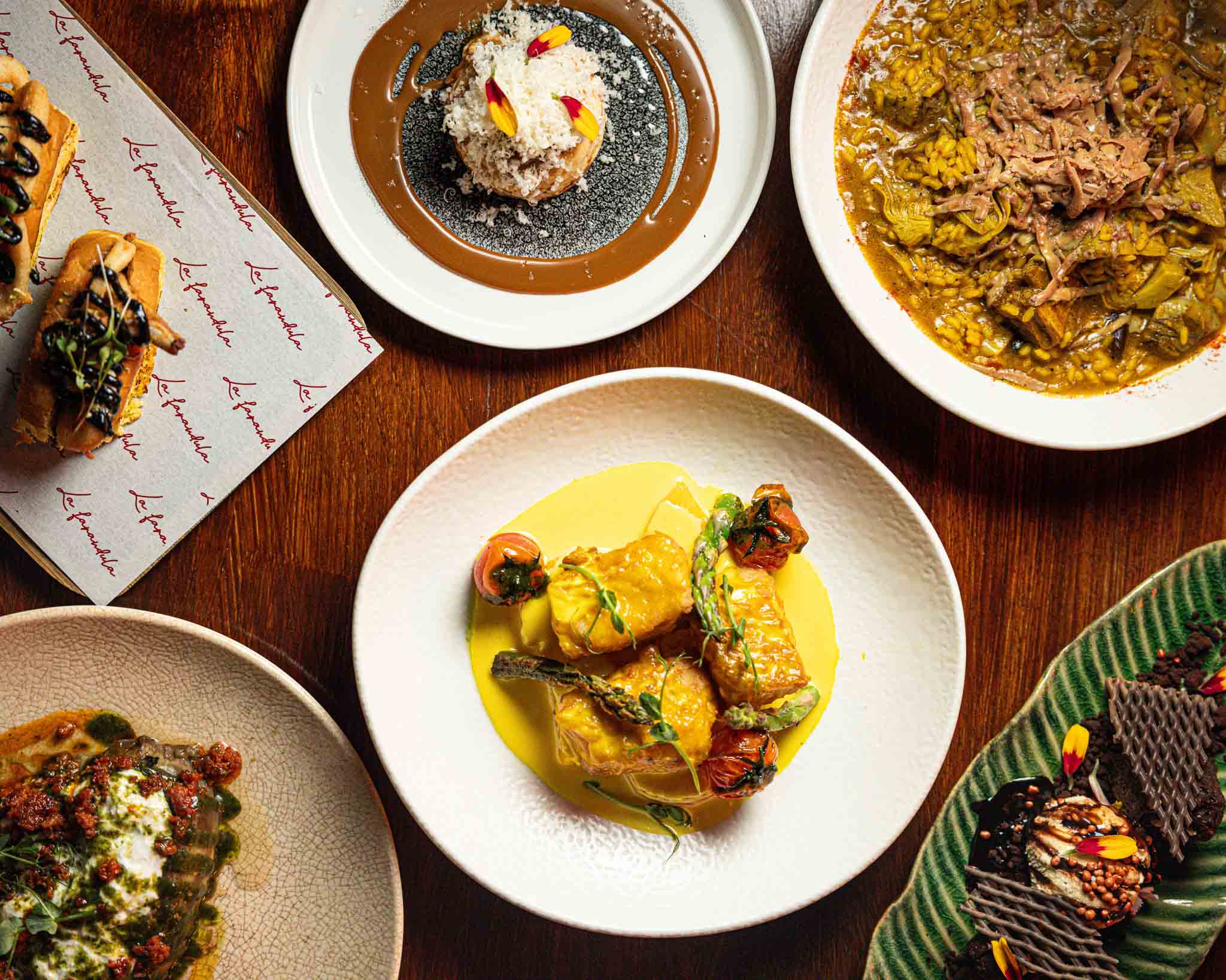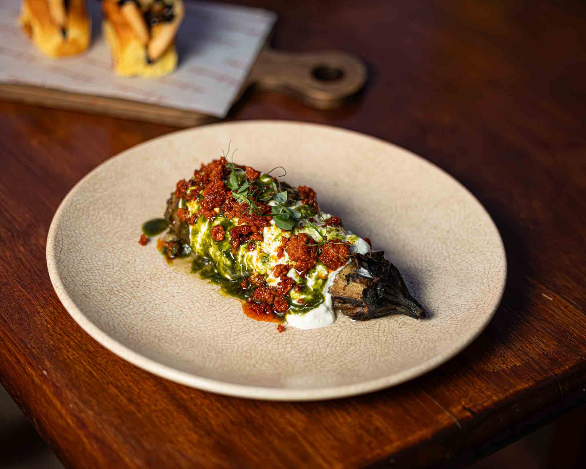 Berenjena asada y ahumada con burrata, sobrasada ibicenca y pesto de pistacho