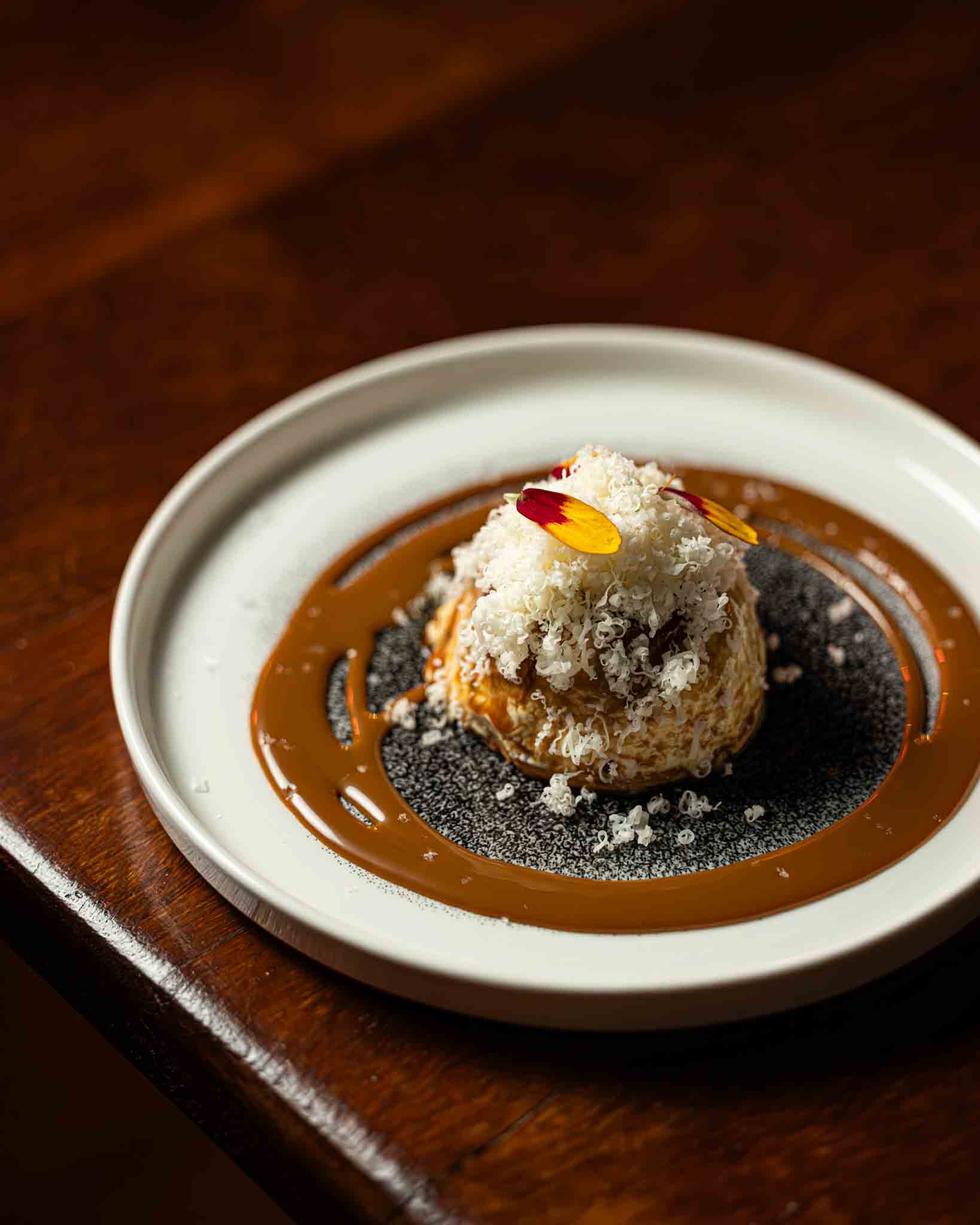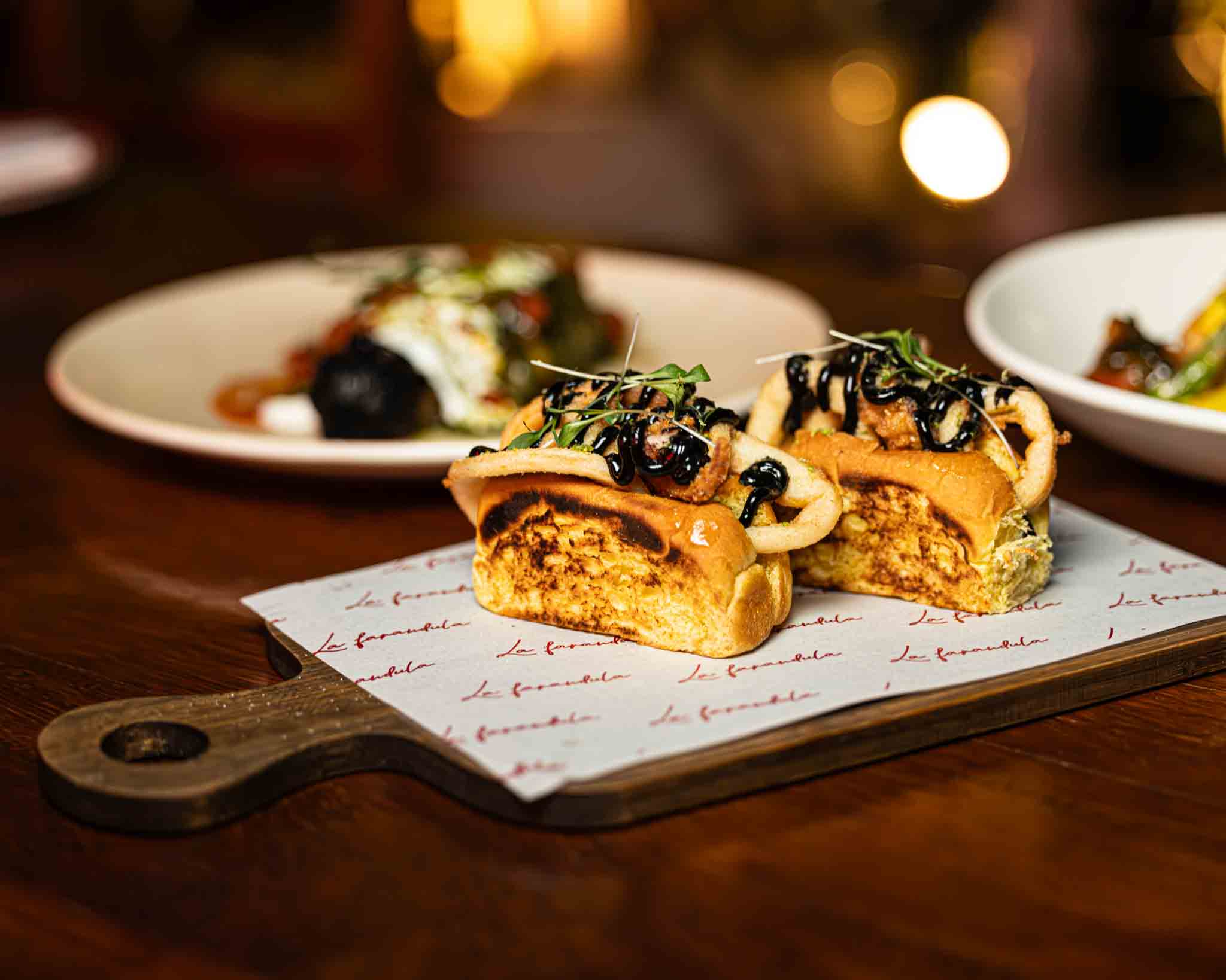 Mini brioche relleno de crujiente de calamar con alioli de ajo negro y ralladura de lima
