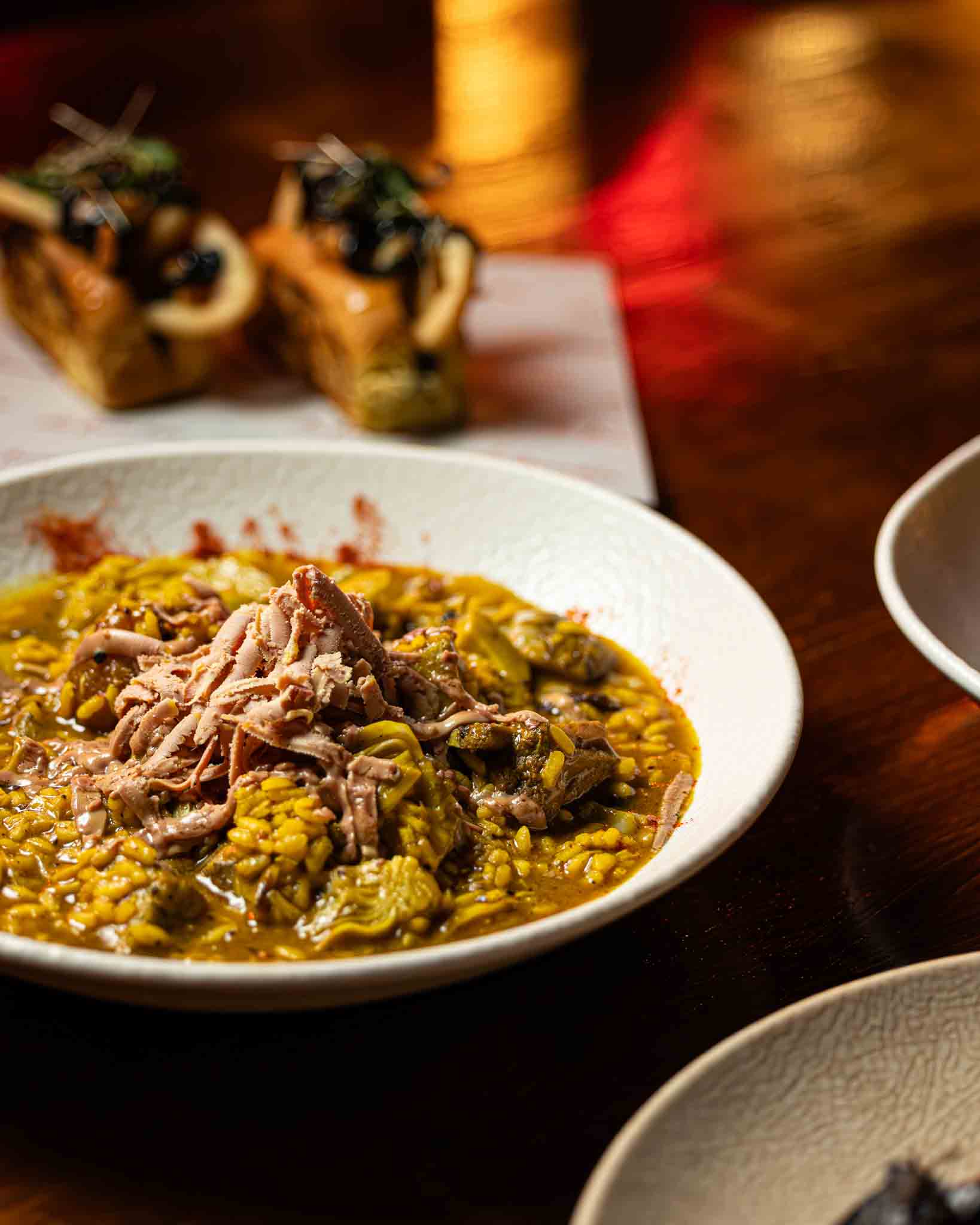 Arroz meloso con alcachofas confitadas en aceite de oliva y foie micuit
