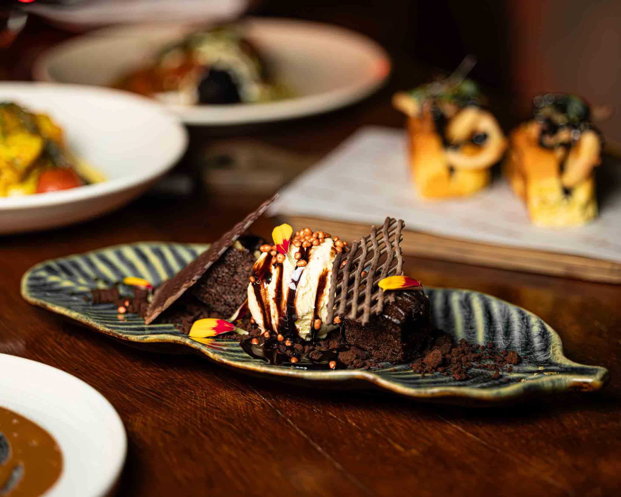 Brownie de chocolate con tierra de algarrobo y helado de café